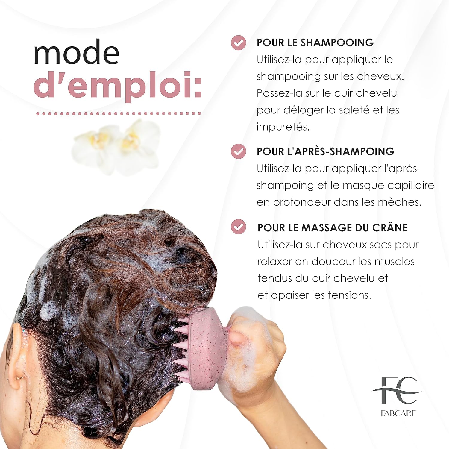 Sur cheveux mouillés, elle s’utilise avec le shampoing en effectuant de légers mouvements circulaires pour répartir le produit et masser le cuir chevelu. Sur cuir chevelu sec, elle permet un massage doux et relaxant, sans agresser la peau.